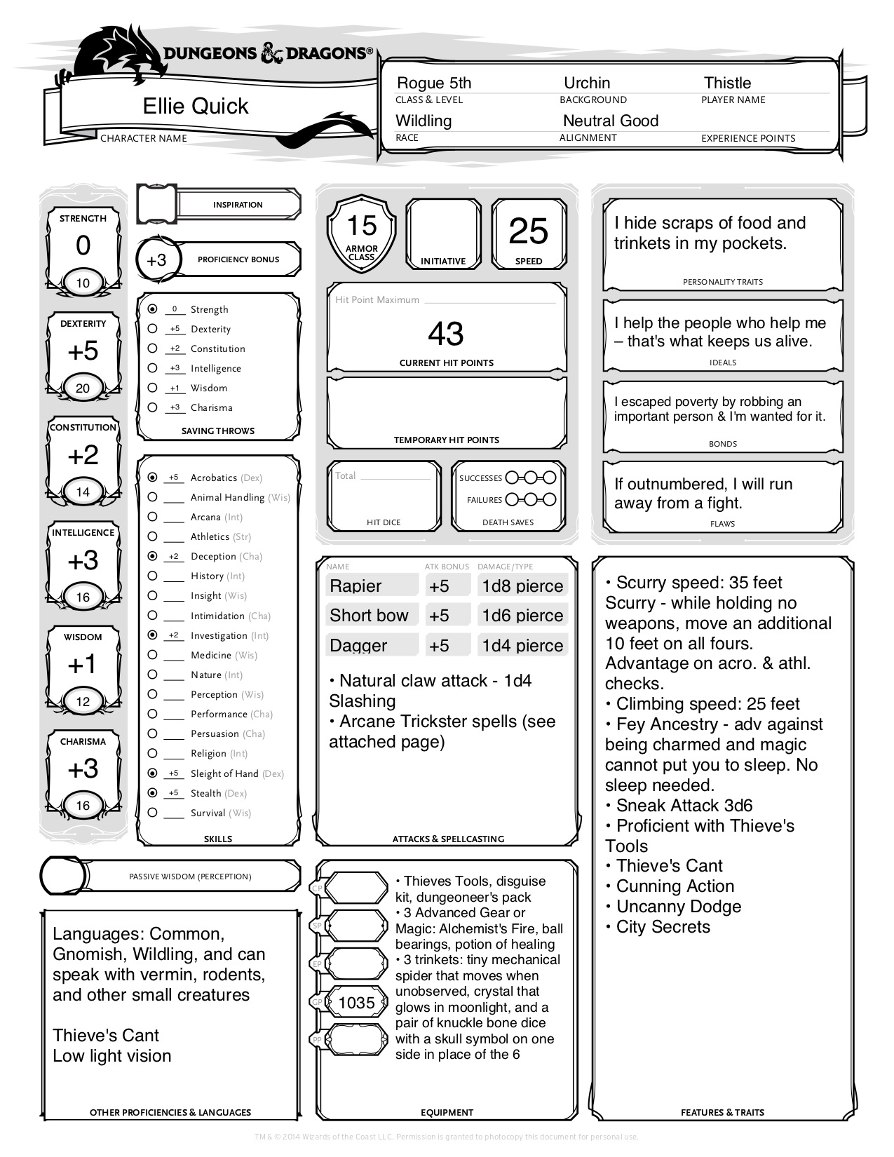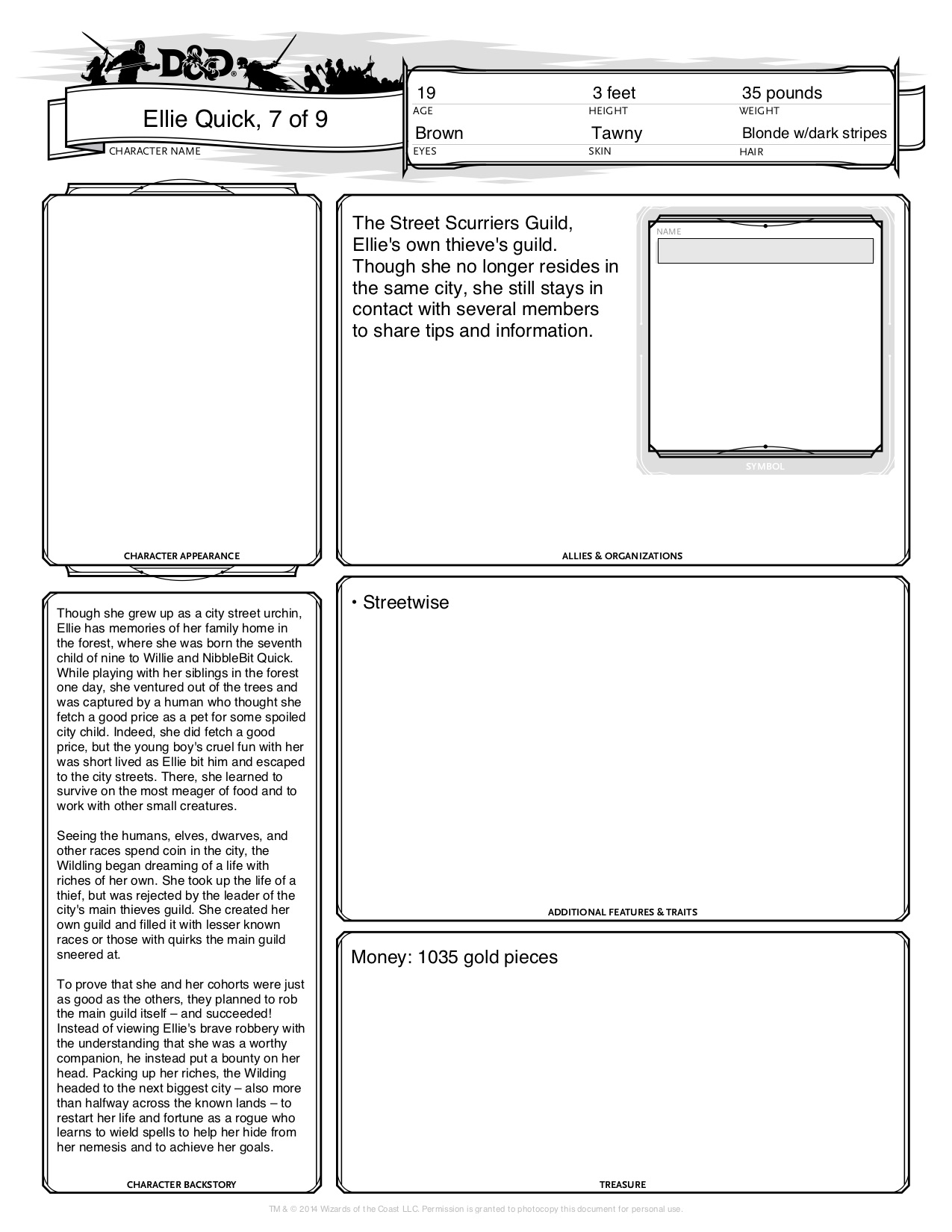 Taking after chipmunks a little more than most Wildlings, Ellie Quick is a chirpy and inquisitive character. As an Stray Wildling, she does sport a few items of clothing, including a vest with many pockets to hold the various trinkets and food that she gathers. A Level 5 Rogue, Ellie has selected Arcane Trickster as her path.