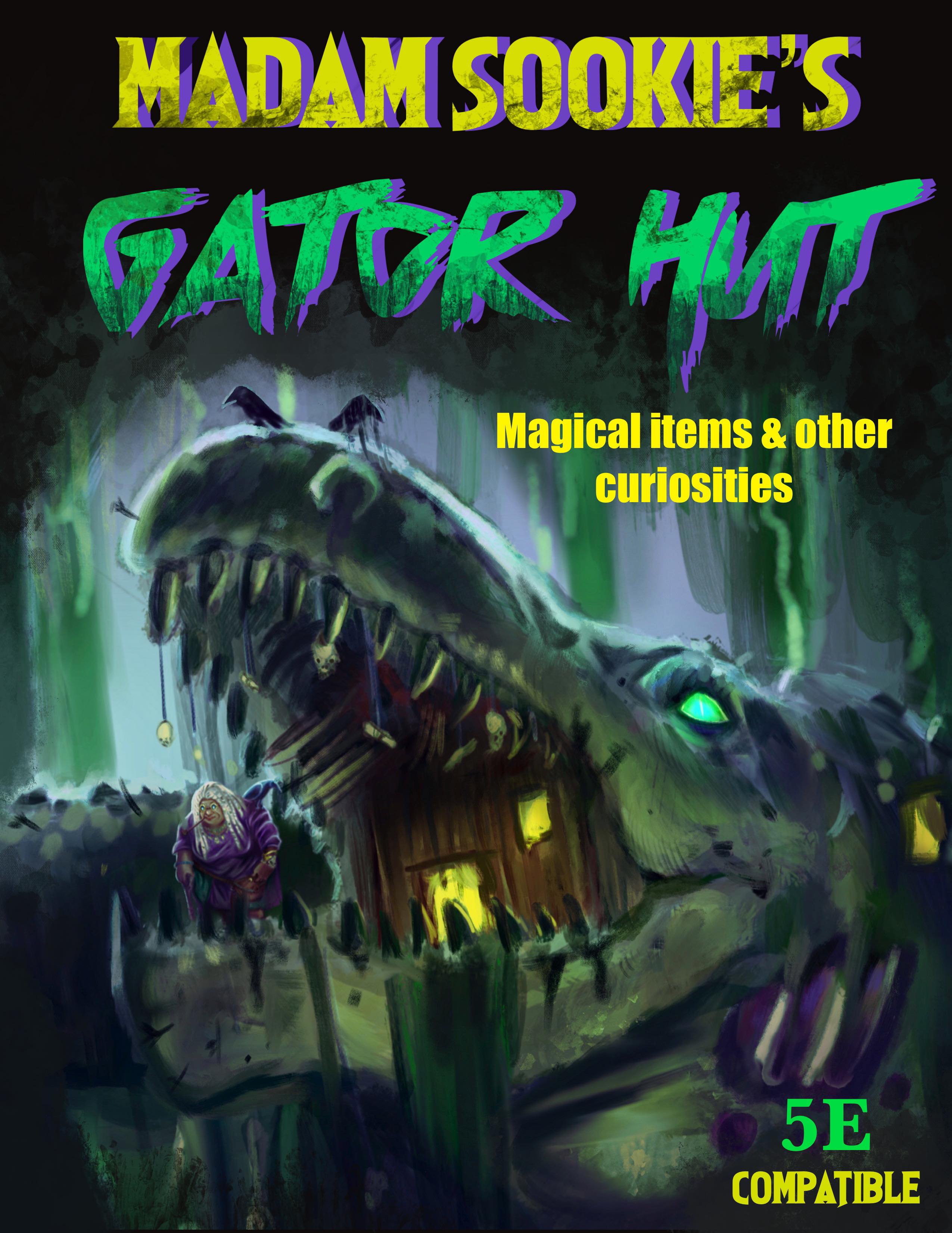 Madam Sookie’s Gator Hut: Magical Items & other Curiosities is a 5e supplement I am creating for folks to drop into their D&D 5e games. In this supplement you will find