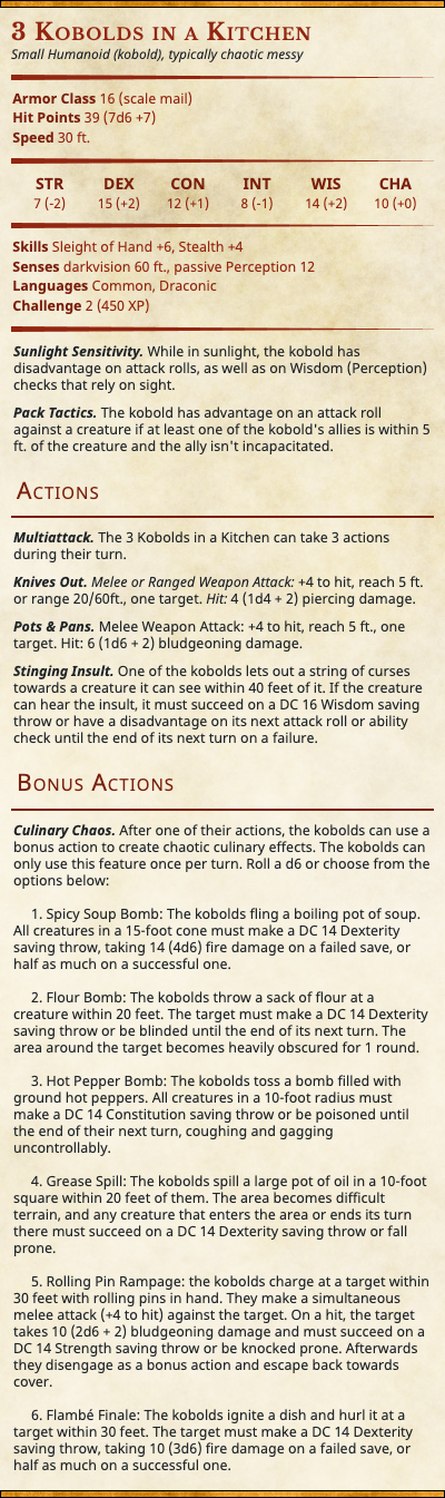 5. Rolling Pin Rampage: the kobolds charge at a target within 30 feet with rolling pins in hand. They make a simultaneous melee attack (+4 to hit) against the target. On a hit, the target takes 10 (2d6 + 2) bludgeoning damage and must succeed on a DC 14 Strength saving throw or be knocked prone. Afterward, they disengage as a bonus action and escape back toward cover.