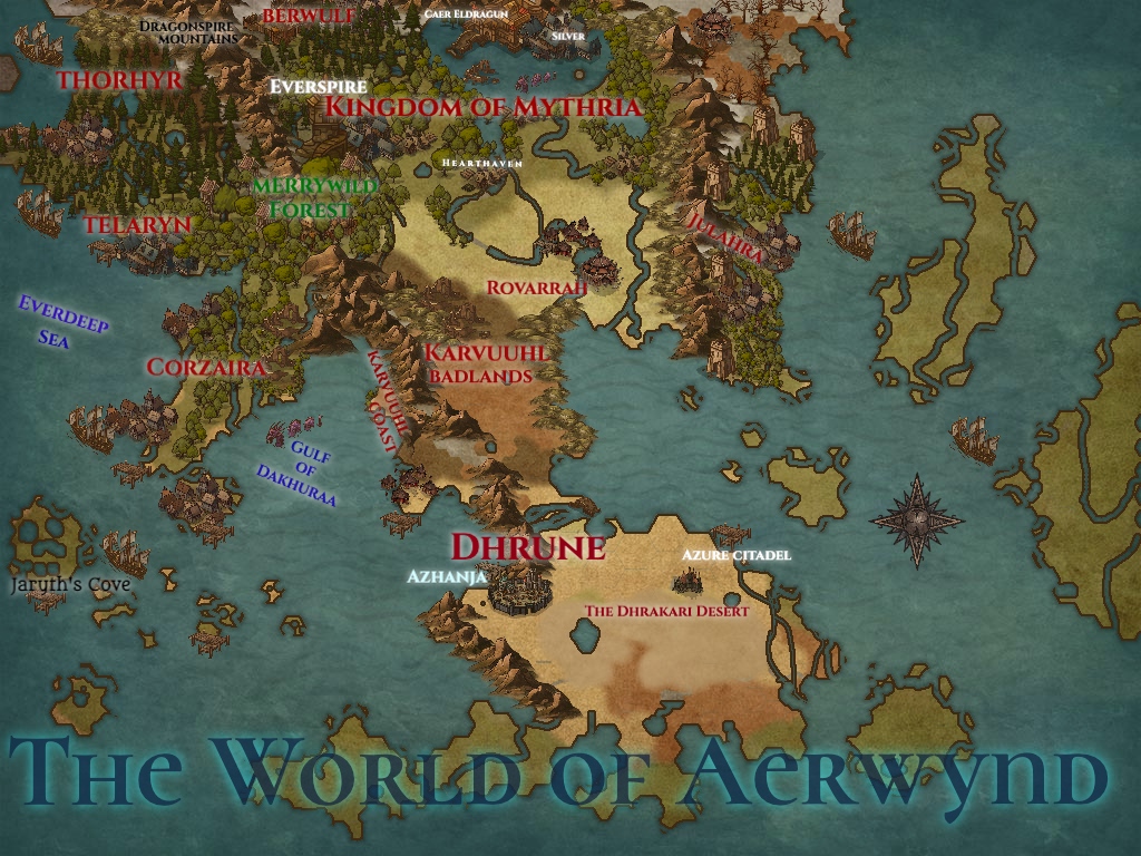 The world of Aerwynd was formed long ago from the blood and bone of ancient dragon gods and demon lords who sought to control the destiny of a star. Aerwynd is named after the ancient dragon goddess, Aerwyndria who sacrificed her body to form the world by binding the other dragon gods and demons to a primordial worldheart.